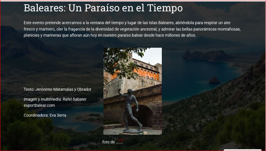 Este evento pretende acercarnos a la ventana del tiempo y lugar de las Islas Baleares, abriéndola para respirar un aire fresco y marinero, oler la fragancia de la diversidad de vegetación ancestral, y admirar las bellas panorámicas montañosas, planicies y marineras que afloran aún hoy en nuestro paraíso balear desde hace millones de años.